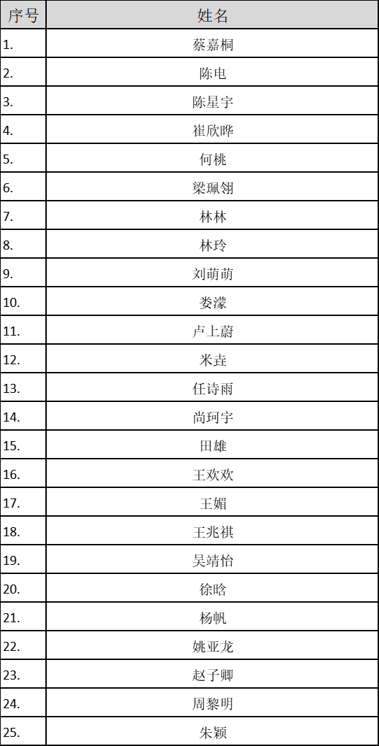 经评审合议,最终确定25名拟录取人选。公示名单如下(按姓氏首字母排序):